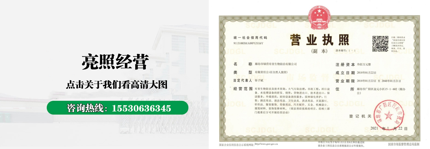 廊坊市綠營(yíng)有害生物防治有限公司從事新建、改建、擴(kuò)建房屋的白蟻預(yù)防和滅治工程及家居有害生物綜合治理工程(包括滅白蟻、滅老鼠、滅蟑螂、滅蚊蠅、滅螞蟻、滅跳蚤、滅蛀蟲(chóng)、滅臭蟲(chóng)、殺螨蟲(chóng)、殺蜈蚣、殺蜘蛛、殺潮蟲(chóng)、殺野蜂,殺衣魚(yú)、殺千足蟲(chóng)、驅(qū)蛇防蛇等);針對(duì)室內(nèi)外的白蟻及各種害蟲(chóng)防治具有多年的實(shí)踐經(jīng)驗(yàn)...